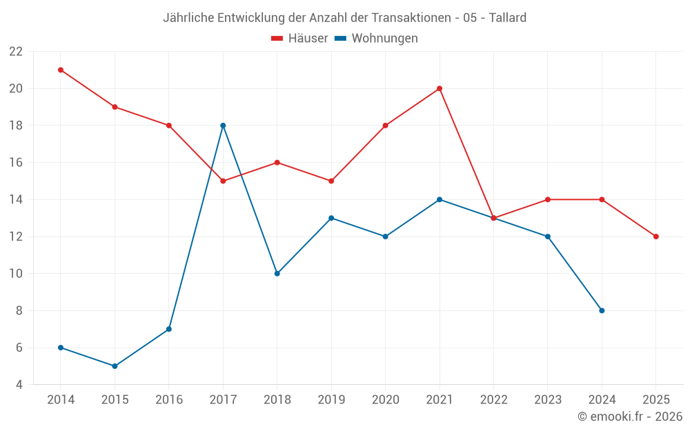 Der Durchschnittspreis auf den 16 Hausgeschäften der letzten 12 Monate in der Gemeinde Tallard betrug 2 906 € pro Quadratmeter für einen mittleren Immobilienwert von 199 750 €. Über diesen Zeitraum hinweg lagen 60% der Transaktionen zwischen 2 177 und 4 033 € pro Quadratmeter (vom 2. bis zum 8. Dezil).