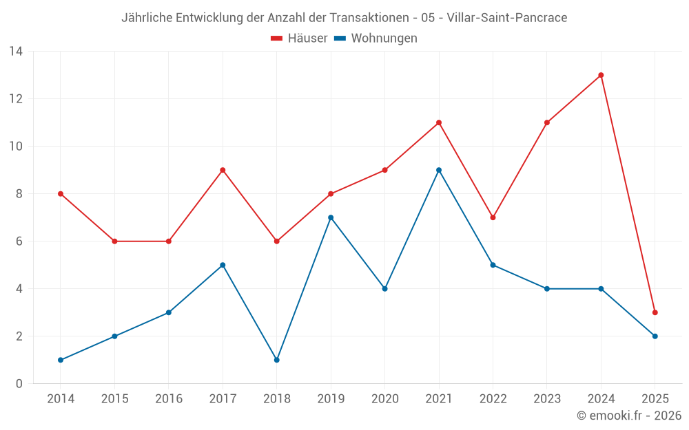 Der Durchschnittspreis auf den 20 Hausgeschäften der letzten 24 Monate in der Gemeinde Villar-Saint-Pancrace betrug 3 824 € pro Quadratmeter für einen mittleren Immobilienwert von 311 250 €. Über diesen Zeitraum hinweg lagen 60% der Transaktionen zwischen 2 672 und 5 232 € pro Quadratmeter (vom 2. bis zum 8. Dezil).