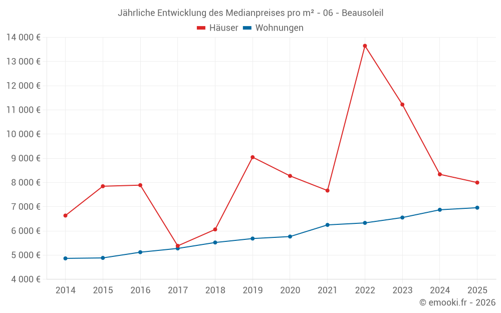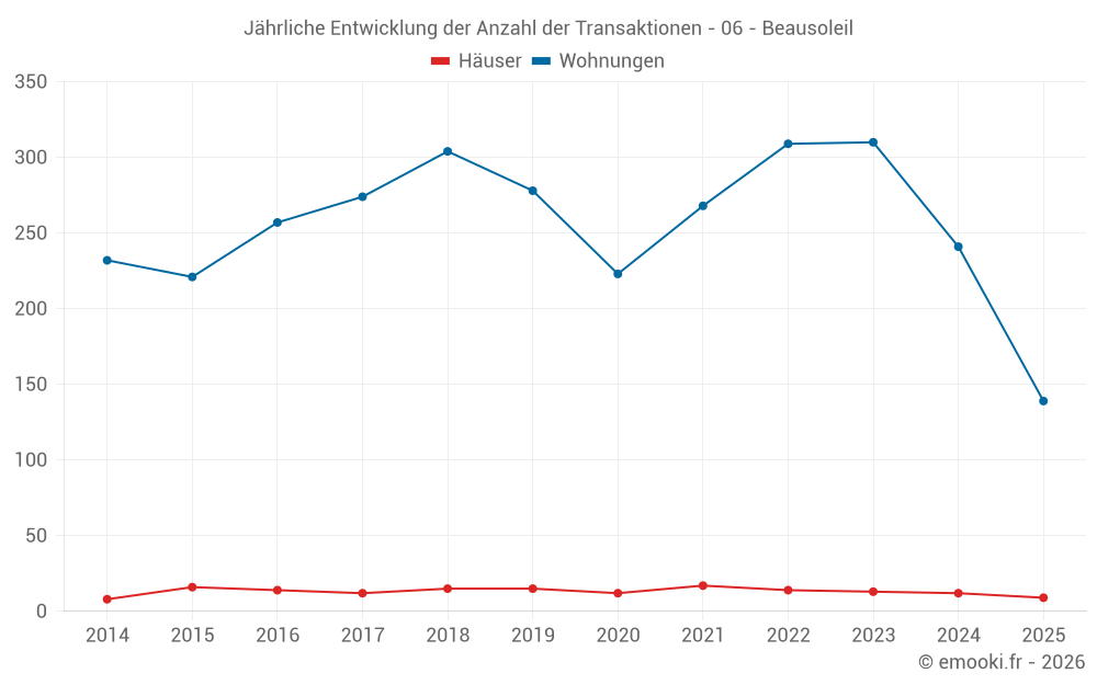 Der Durchschnittspreis auf den 27 Hausgeschäften der letzten 24 Monate in der Gemeinde Beausoleil betrug 9 792 € pro Quadratmeter für einen mittleren Immobilienwert von 760 000 €. Über diesen Zeitraum hinweg lagen 60% der Transaktionen zwischen 5 915 und 14 812 € pro Quadratmeter (vom 2. bis zum 8. Dezil).