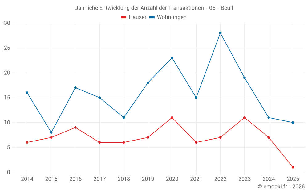 Der Durchschnittspreis auf den 14 Hausgeschäften der letzten 24 Monate in der Gemeinde Beuil betrug 3 278 € pro Quadratmeter für einen mittleren Immobilienwert von 250 000 €. Über diesen Zeitraum hinweg lagen 60% der Transaktionen zwischen 1 994 und 5 116 € pro Quadratmeter (vom 2. bis zum 8. Dezil).