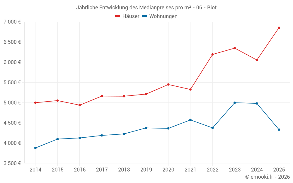 Der Durchschnittspreis auf den 33 Hausgeschäften der letzten 6 Monate in der Gemeinde Biot betrug 6 855 € pro Quadratmeter für einen mittleren Immobilienwert von 740 000 €. Über diesen Zeitraum hinweg lagen 60% der Transaktionen zwischen 4 837 und 8 369 € pro Quadratmeter (vom 2. bis zum 8. Dezil).