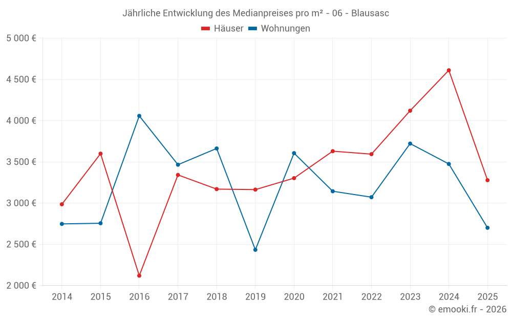 Der Durchschnittspreis auf den 17 Hausgeschäften der letzten 12 Monate in der Gemeinde Blausasc betrug 4 238 € pro Quadratmeter für einen mittleren Immobilienwert von 415 000 €. Über diesen Zeitraum hinweg lagen 60% der Transaktionen zwischen 2 888 und 5 157 € pro Quadratmeter (vom 2. bis zum 8. Dezil).