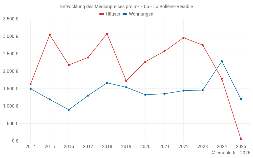 Der Durchschnittspreis auf den 14 Wohnungstransaktionen der letzten 24 Monate in der Gemeinde La Bollène-Vésubie betrug 1 630 € pro Quadratmeter für einen mittleren Immobilienwert von 91 000 €. Über diesen Zeitraum hinweg lagen 60% der Transaktionen zwischen 1 208 und 2 393 € pro Quadratmeter (vom 2. bis zum 8. Dezil).