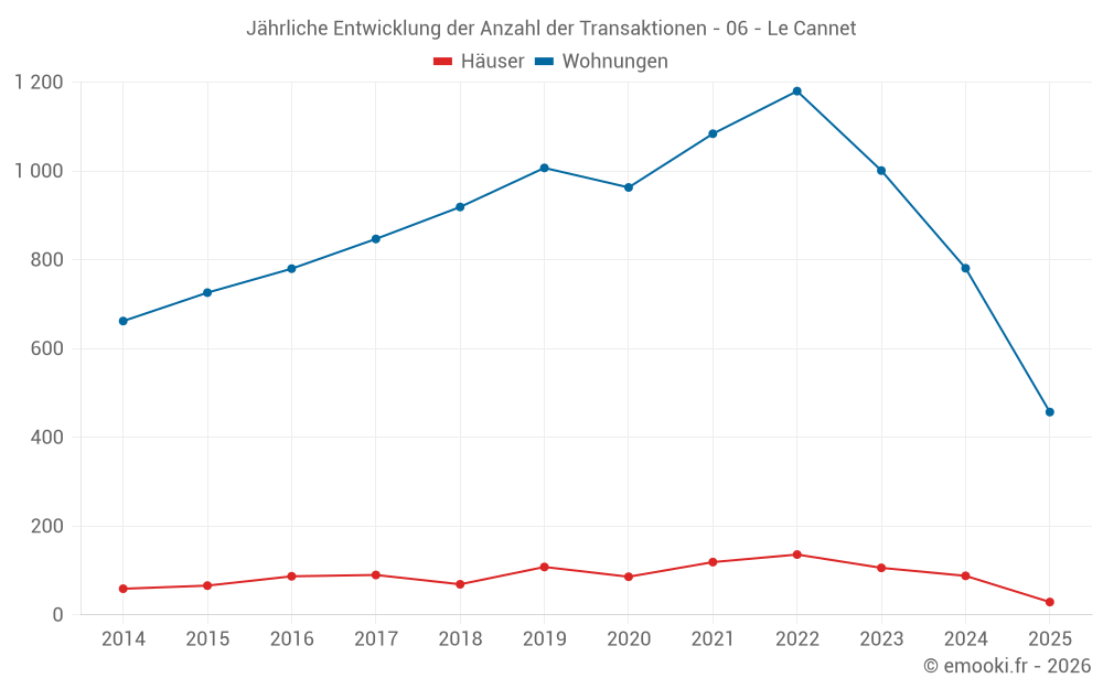Der Durchschnittspreis auf den 29 Hausgeschäften der letzten 6 Monate in der Gemeinde Le Cannet betrug 6 711 € pro Quadratmeter für einen mittleren Immobilienwert von 631 840 €. Über diesen Zeitraum hinweg lagen 60% der Transaktionen zwischen 5 147 und 9 575 € pro Quadratmeter (vom 2. bis zum 8. Dezil).