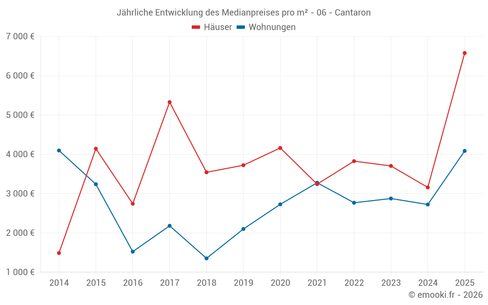 Der Durchschnittspreis auf den 16 Hausgeschäften der letzten 24 Monate in der Gemeinde Cantaron betrug 3 610 € pro Quadratmeter für einen mittleren Immobilienwert von 331 000 €. Über diesen Zeitraum hinweg lagen 60% der Transaktionen zwischen 2 074 und 4 297 € pro Quadratmeter (vom 2. bis zum 8. Dezil).