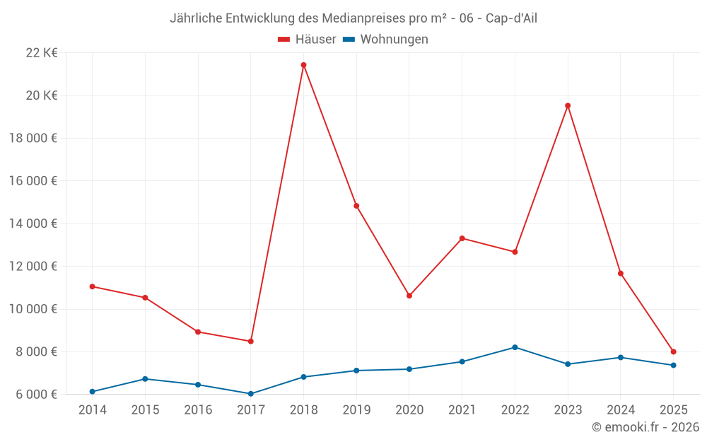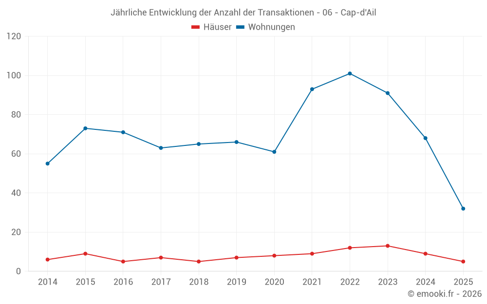 Der Durchschnittspreis auf den 25 Hausgeschäften der letzten 24 Monate in der Gemeinde Cap-d'Ail betrug 11 667 € pro Quadratmeter für einen mittleren Immobilienwert von 1 150 000 €. Über diesen Zeitraum hinweg lagen 60% der Transaktionen zwischen 8 734 und 24 233 € pro Quadratmeter (vom 2. bis zum 8. Dezil).