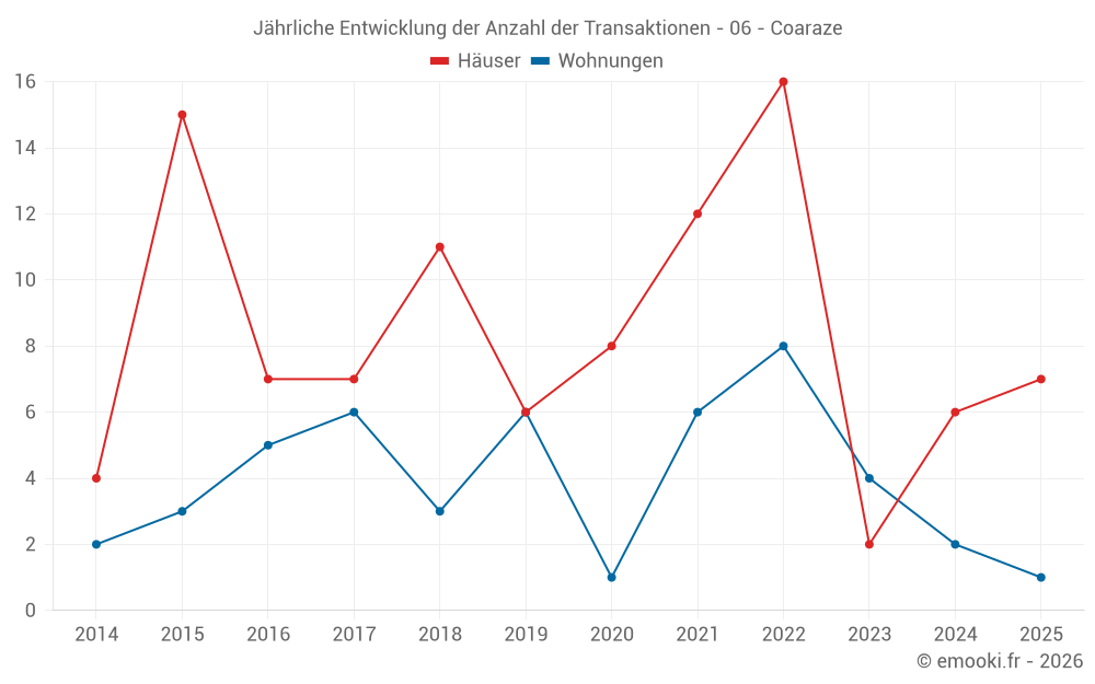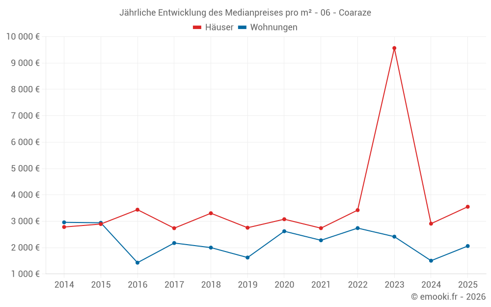 Der Durchschnittspreis auf den 14 Hausgeschäften der letzten 24 Monate in der Gemeinde Coaraze betrug 3 264 € pro Quadratmeter für einen mittleren Immobilienwert von 321 500 €. Über diesen Zeitraum hinweg lagen 60% der Transaktionen zwischen 2 829 und 3 904 € pro Quadratmeter (vom 2. bis zum 8. Dezil).