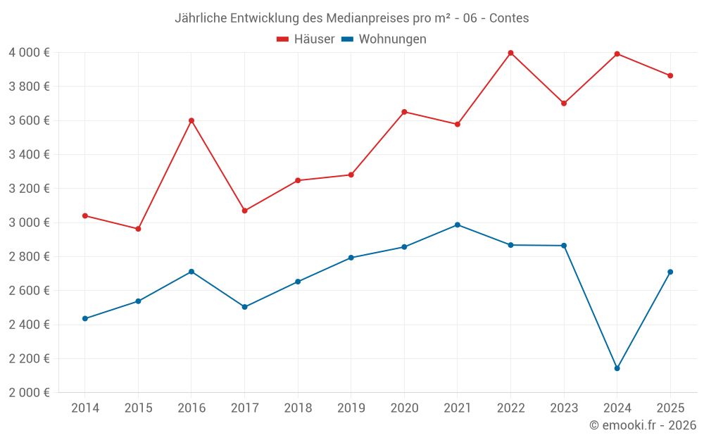 Der Durchschnittspreis auf den 25 Hausgeschäften der letzten 12 Monate in der Gemeinde Contes betrug 3 992 € pro Quadratmeter für einen mittleren Immobilienwert von 363 000 €. Über diesen Zeitraum hinweg lagen 60% der Transaktionen zwischen 2 879 und 5 134 € pro Quadratmeter (vom 2. bis zum 8. Dezil).