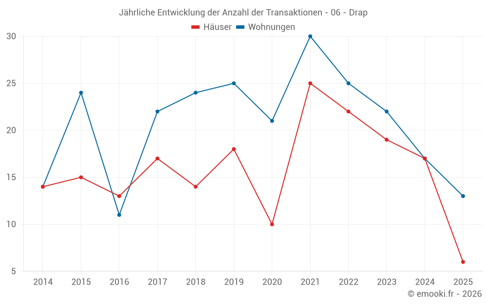 Der Durchschnittspreis auf den 36 Hausgeschäften der letzten 24 Monate in der Gemeinde Drap betrug 4 376 € pro Quadratmeter für einen mittleren Immobilienwert von 419 175 €. Über diesen Zeitraum hinweg lagen 60% der Transaktionen zwischen 3 611 und 5 952 € pro Quadratmeter (vom 2. bis zum 8. Dezil).