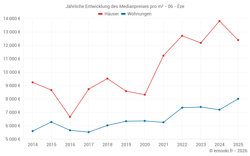Der Durchschnittspreis auf den 30 Wohnungstransaktionen der letzten 12 Monate in der Gemeinde Èze betrug 9 214 € pro Quadratmeter für einen mittleren Immobilienwert von 542 150 €. Über diesen Zeitraum hinweg lagen 60% der Transaktionen zwischen 6 217 und 13 561 € pro Quadratmeter (vom 2. bis zum 8. Dezil).