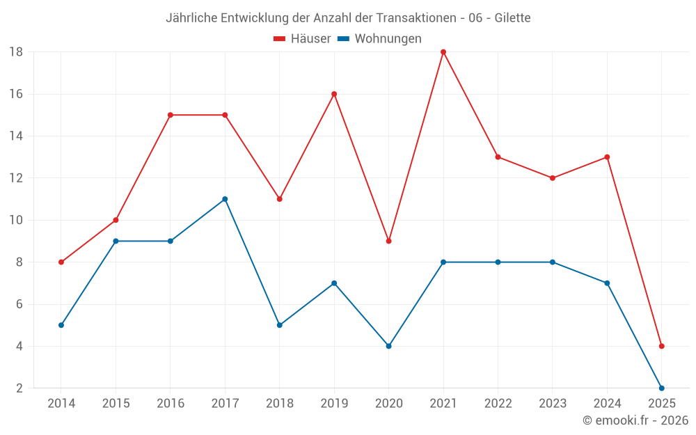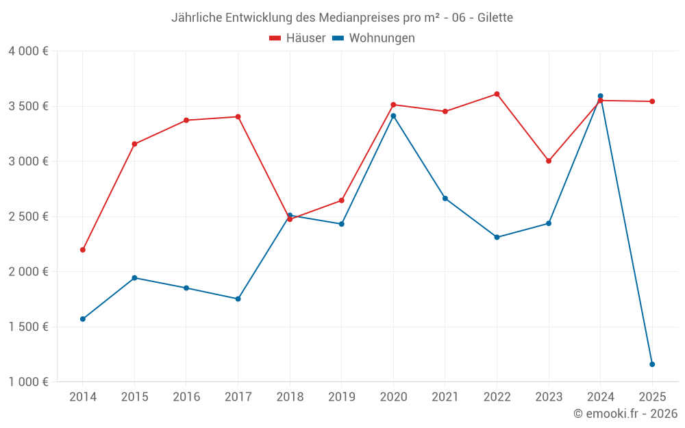 Der Durchschnittspreis auf den 23 Hausgeschäften der letzten 24 Monate in der Gemeinde Gilette betrug 3 552 € pro Quadratmeter für einen mittleren Immobilienwert von 270 000 €. Über diesen Zeitraum hinweg lagen 60% der Transaktionen zwischen 1 673 und 4 491 € pro Quadratmeter (vom 2. bis zum 8. Dezil).