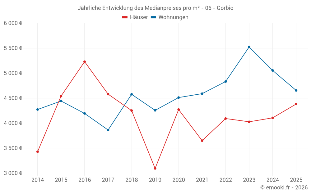Der Durchschnittspreis auf den 20 Wohnungstransaktionen der letzten 24 Monate in der Gemeinde Gorbio betrug 4 939 € pro Quadratmeter für einen mittleren Immobilienwert von 237 000 €. Über diesen Zeitraum hinweg lagen 60% der Transaktionen zwischen 2 924 und 5 625 € pro Quadratmeter (vom 2. bis zum 8. Dezil).