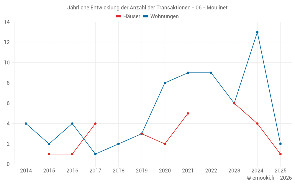 Der Durchschnittspreis auf den 21 Wohnungstransaktionen der letzten 24 Monate in der Gemeinde Moulinet betrug 1 081 € pro Quadratmeter für einen mittleren Immobilienwert von 42 000 €. Über diesen Zeitraum hinweg lagen 60% der Transaktionen zwischen 526 und 1 313 € pro Quadratmeter (vom 2. bis zum 8. Dezil).