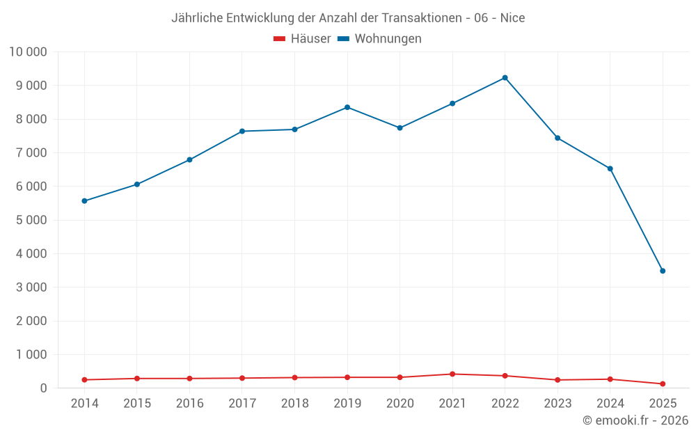 Der Durchschnittspreis auf den 57 Hausgeschäften der letzten 3 Monate in der Gemeinde Nice betrug 6 932 € pro Quadratmeter für einen mittleren Immobilienwert von 723 250 €. Über diesen Zeitraum hinweg lagen 60% der Transaktionen zwischen 4 119 und 11 574 € pro Quadratmeter (vom 2. bis zum 8. Dezil).