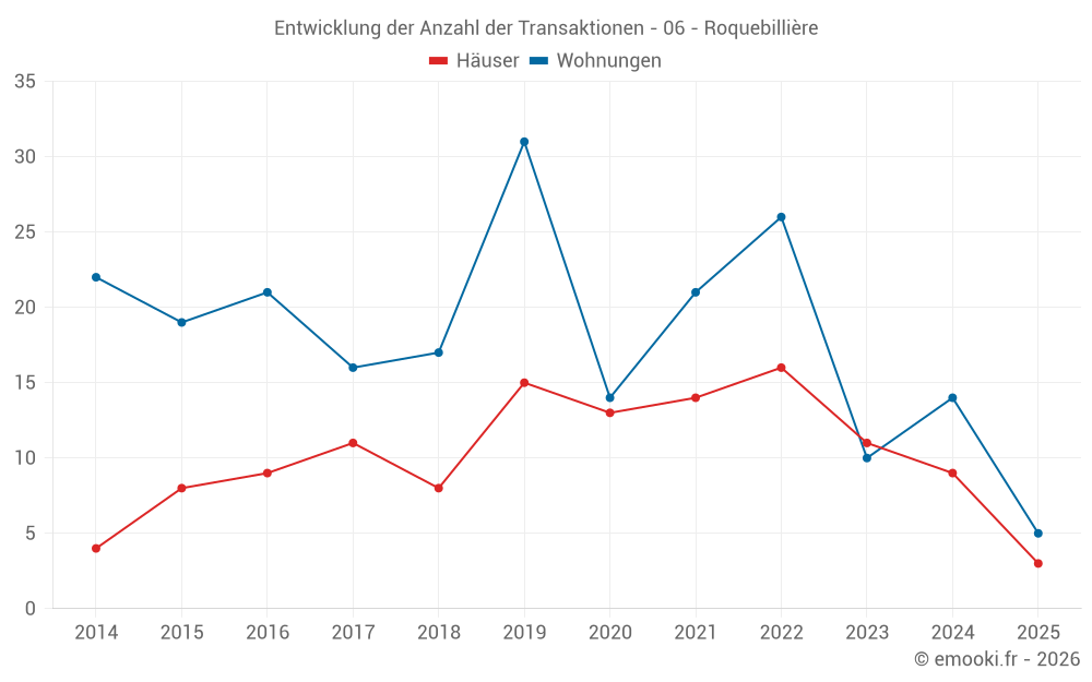 Der Durchschnittspreis auf den 18 Hausgeschäften der letzten 24 Monate in der Gemeinde Roquebillière betrug 2 912 € pro Quadratmeter für einen mittleren Immobilienwert von 250 500 €. Über diesen Zeitraum hinweg lagen 60% der Transaktionen zwischen 1 400 und 4 582 € pro Quadratmeter (vom 2. bis zum 8. Dezil).