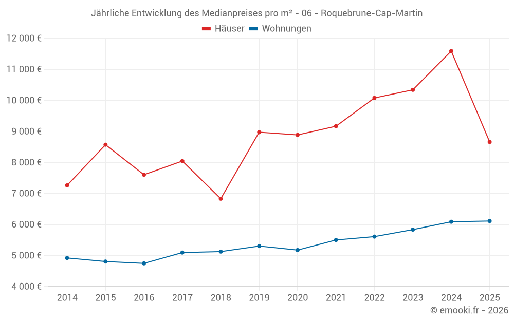 Der Durchschnittspreis auf den 31 Hausgeschäften der letzten 6 Monate in der Gemeinde Roquebrune-Cap-Martin betrug 8 659 € pro Quadratmeter für einen mittleren Immobilienwert von 1 550 000 €. Über diesen Zeitraum hinweg lagen 60% der Transaktionen zwischen 5 102 und 22 330 € pro Quadratmeter (vom 2. bis zum 8. Dezil).