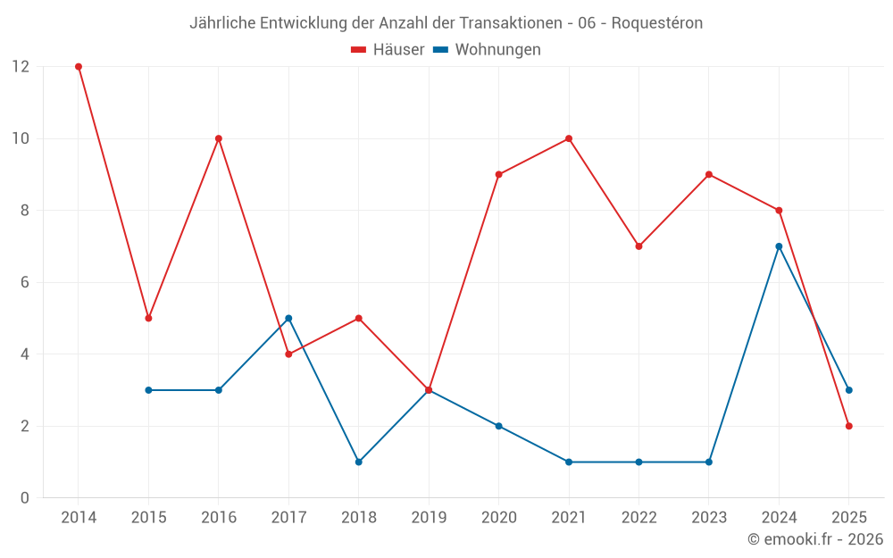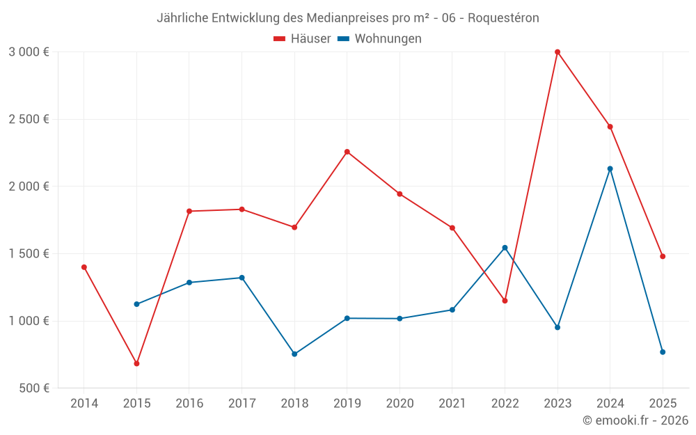 Der Durchschnittspreis auf den 15 Hausgeschäften der letzten 24 Monate in der Gemeinde Roquestéron betrug 2 625 € pro Quadratmeter für einen mittleren Immobilienwert von 215 000 €. Über diesen Zeitraum hinweg lagen 60% der Transaktionen zwischen 1 685 und 3 457 € pro Quadratmeter (vom 2. bis zum 8. Dezil).