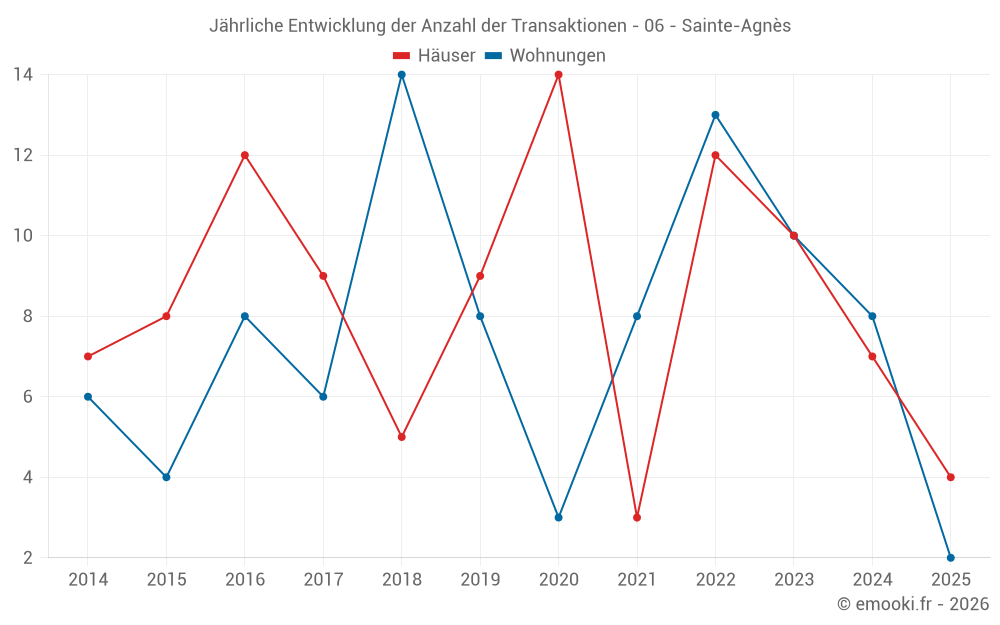 Der Durchschnittspreis auf den 16 Hausgeschäften der letzten 24 Monate in der Gemeinde Sainte-Agnès betrug 4 487 € pro Quadratmeter für einen mittleren Immobilienwert von 330 000 €. Über diesen Zeitraum hinweg lagen 60% der Transaktionen zwischen 3 213 und 6 333 € pro Quadratmeter (vom 2. bis zum 8. Dezil).