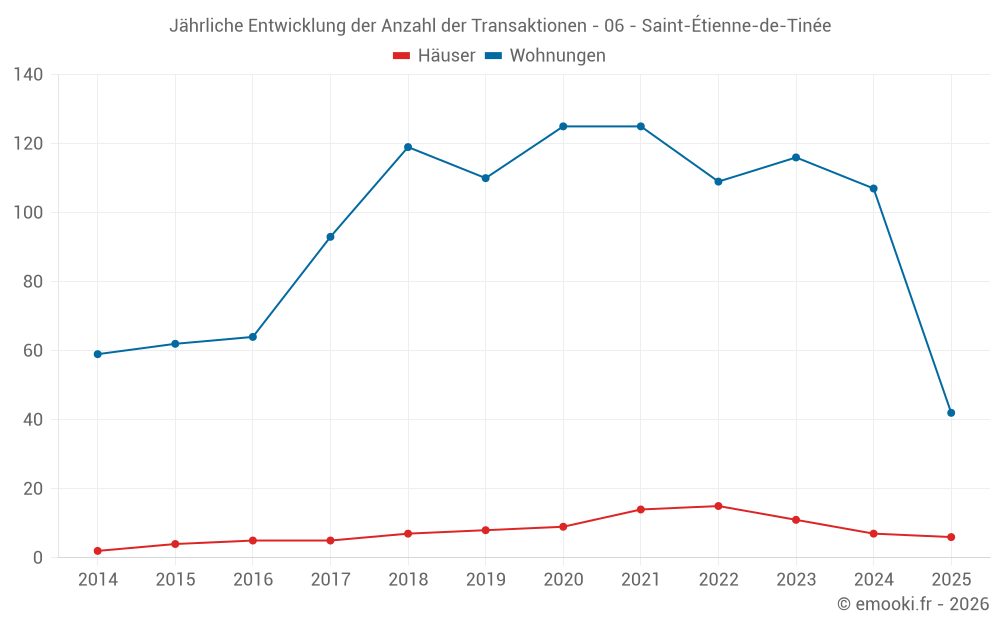 Der Durchschnittspreis auf den 17 Hausgeschäften der letzten 24 Monate in der Gemeinde Saint-Étienne-de-Tinée betrug 5 769 € pro Quadratmeter für einen mittleren Immobilienwert von 400 000 €. Über diesen Zeitraum hinweg lagen 60% der Transaktionen zwischen 1 773 und 10 895 € pro Quadratmeter (vom 2. bis zum 8. Dezil).