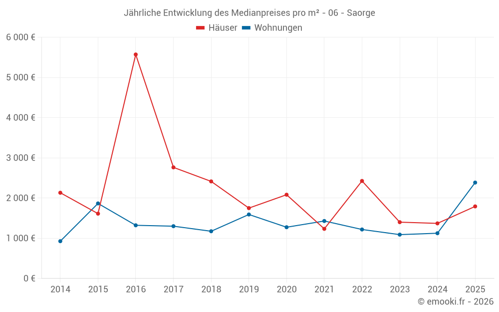 Der Durchschnittspreis auf den 23 Wohnungstransaktionen der letzten 24 Monate in der Gemeinde Saorge betrug 1 125 € pro Quadratmeter für einen mittleren Immobilienwert von 55 000 €. Über diesen Zeitraum hinweg lagen 60% der Transaktionen zwischen 839 und 1 925 € pro Quadratmeter (vom 2. bis zum 8. Dezil).