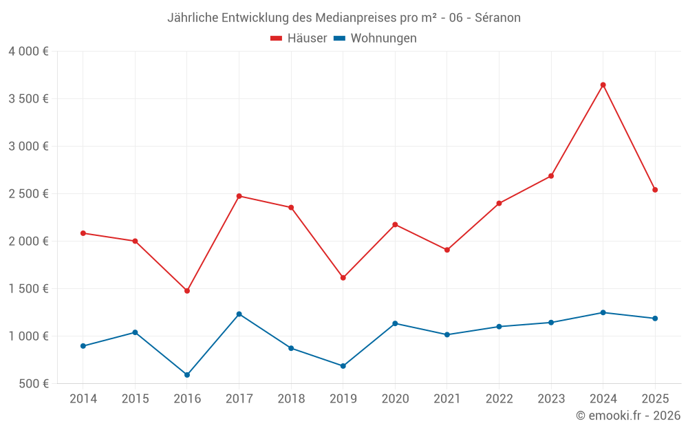 Der Durchschnittspreis auf den 23 Hausgeschäften der letzten 24 Monate in der Gemeinde Séranon betrug 2 899 € pro Quadratmeter für einen mittleren Immobilienwert von 227 000 €. Über diesen Zeitraum hinweg lagen 60% der Transaktionen zwischen 2 495 und 3 678 € pro Quadratmeter (vom 2. bis zum 8. Dezil).
