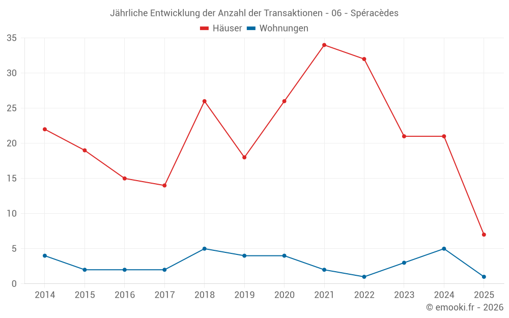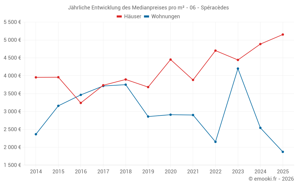Der Durchschnittspreis auf den 38 Hausgeschäften der letzten 24 Monate in der Gemeinde Spéracèdes betrug 5 014 € pro Quadratmeter für einen mittleren Immobilienwert von 693 750 €. Über diesen Zeitraum hinweg lagen 60% der Transaktionen zwischen 3 737 und 6 775 € pro Quadratmeter (vom 2. bis zum 8. Dezil).