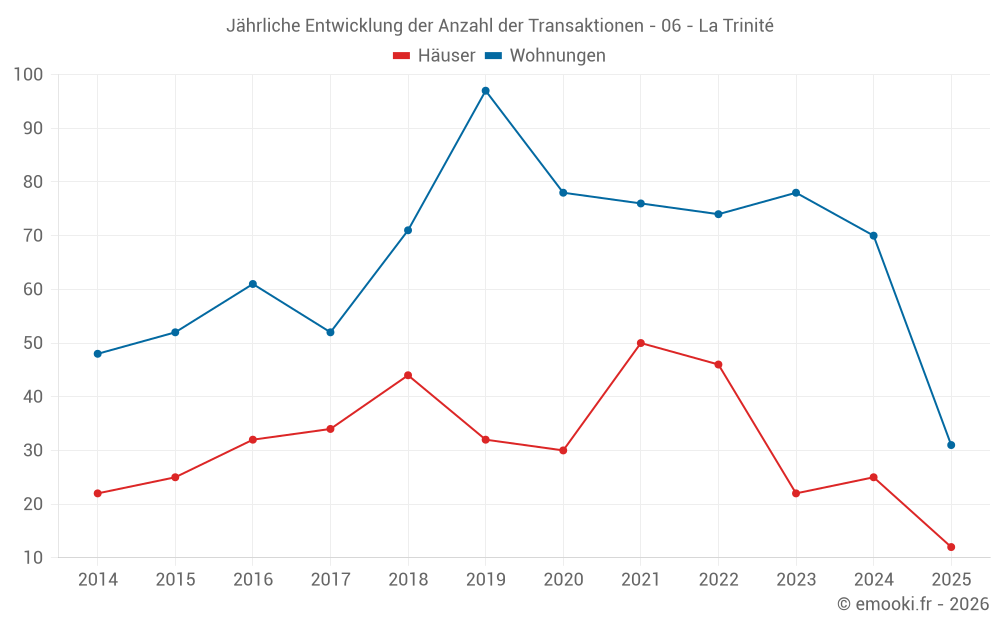 Der Durchschnittspreis auf den 31 Wohnungstransaktionen der letzten 6 Monate in der Gemeinde La Trinité betrug 3 236 € pro Quadratmeter für einen mittleren Immobilienwert von 185 000 €. Über diesen Zeitraum hinweg lagen 60% der Transaktionen zwischen 2 632 und 4 035 € pro Quadratmeter (vom 2. bis zum 8. Dezil).