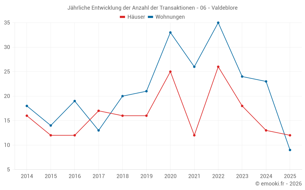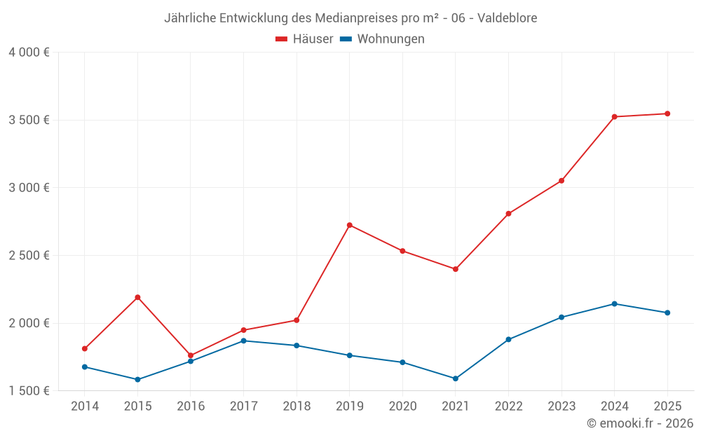 Der Durchschnittspreis auf den 25 Wohnungstransaktionen der letzten 12 Monate in der Gemeinde Valdeblore betrug 2 143 € pro Quadratmeter für einen mittleren Immobilienwert von 81 000 €. Über diesen Zeitraum hinweg lagen 60% der Transaktionen zwischen 1 606 und 2 502 € pro Quadratmeter (vom 2. bis zum 8. Dezil).