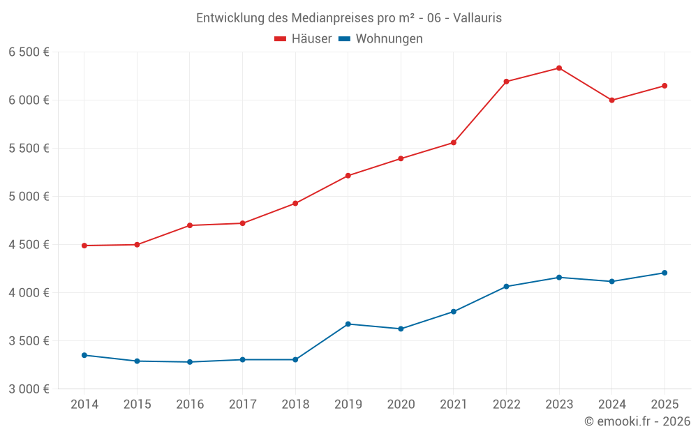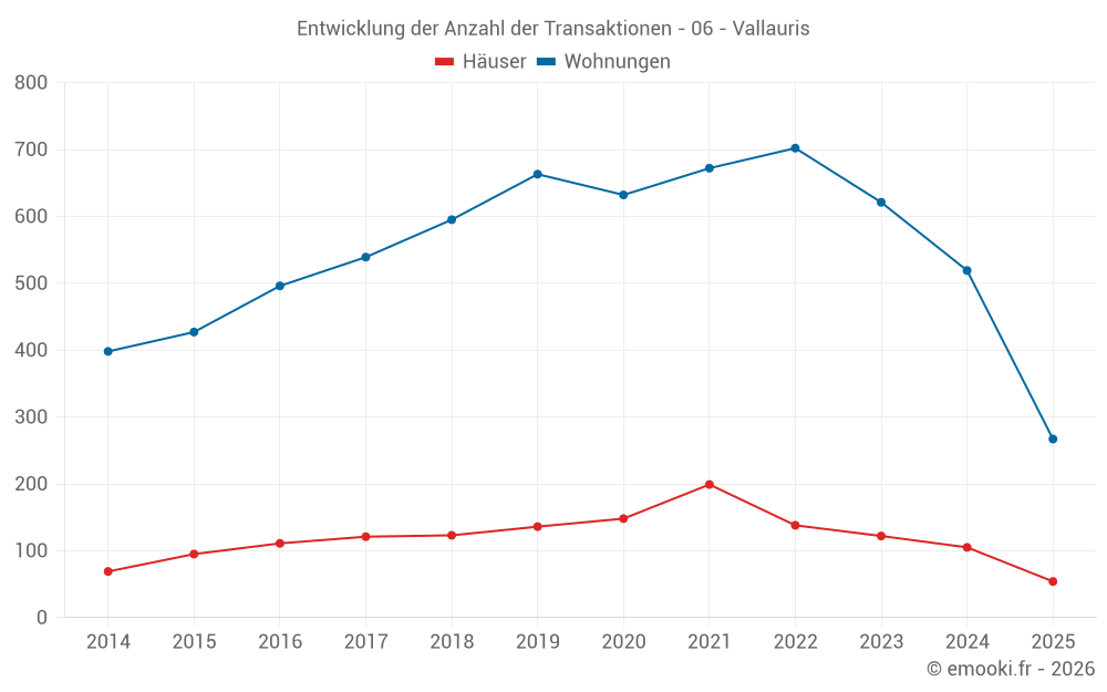 Der Durchschnittspreis auf den 133 Wohnungstransaktionen der letzten 3 Monate in der Gemeinde Vallauris betrug 4 286 € pro Quadratmeter für einen mittleren Immobilienwert von 173 000 €. Über diesen Zeitraum hinweg lagen 60% der Transaktionen zwischen 3 020 und 5 725 € pro Quadratmeter (vom 2. bis zum 8. Dezil).