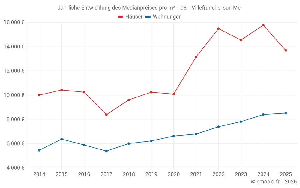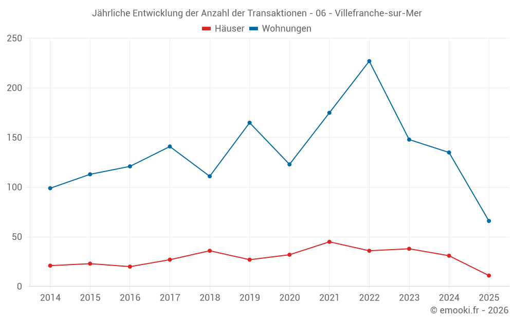 Der Durchschnittspreis auf den 28 Hausgeschäften der letzten 12 Monate in der Gemeinde Villefranche-sur-Mer betrug 14 967 € pro Quadratmeter für einen mittleren Immobilienwert von 2 850 000 €. Über diesen Zeitraum hinweg lagen 60% der Transaktionen zwischen 11 943 und 21 378 € pro Quadratmeter (vom 2. bis zum 8. Dezil).