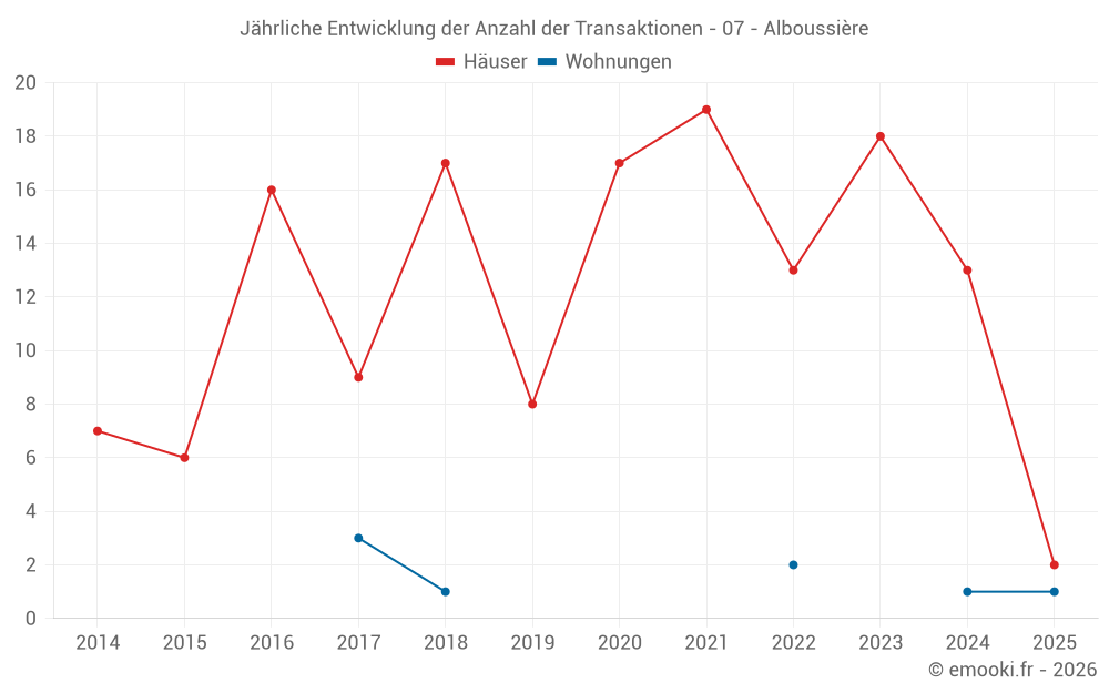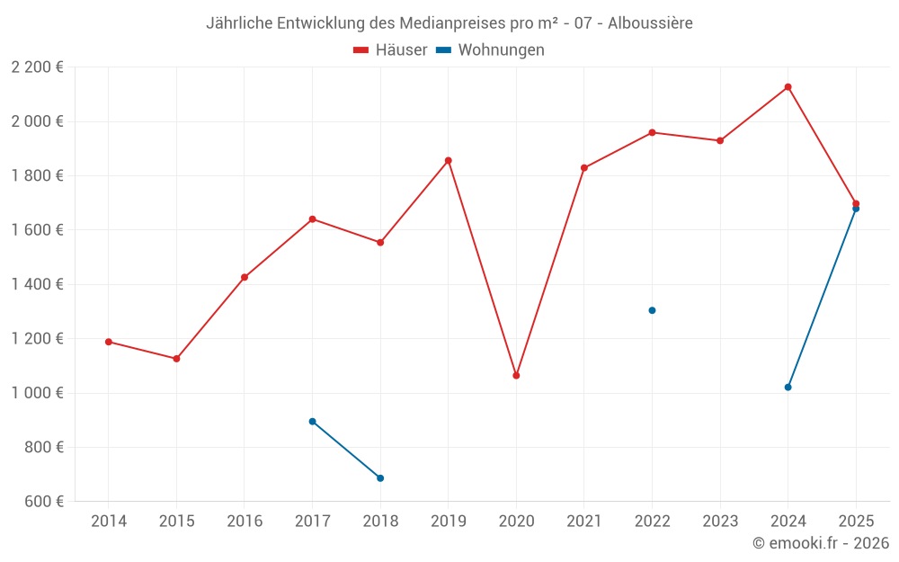 Der Durchschnittspreis auf den 28 Hausgeschäften der letzten 24 Monate in der Gemeinde Alboussière betrug 2 020 € pro Quadratmeter für einen mittleren Immobilienwert von 179 425 €. Über diesen Zeitraum hinweg lagen 60% der Transaktionen zwischen 1 339 und 2 574 € pro Quadratmeter (vom 2. bis zum 8. Dezil).