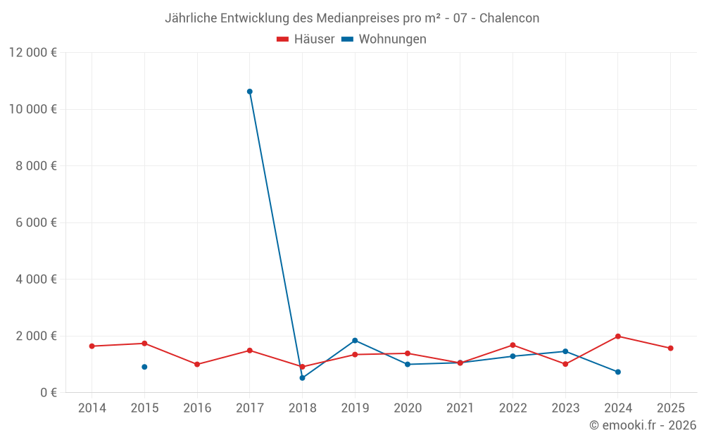 Der Durchschnittspreis auf den 17 Hausgeschäften der letzten 24 Monate in der Gemeinde Chalencon betrug 1 591 € pro Quadratmeter für einen mittleren Immobilienwert von 89 500 €. Über diesen Zeitraum hinweg lagen 60% der Transaktionen zwischen 825 und 2 475 € pro Quadratmeter (vom 2. bis zum 8. Dezil).