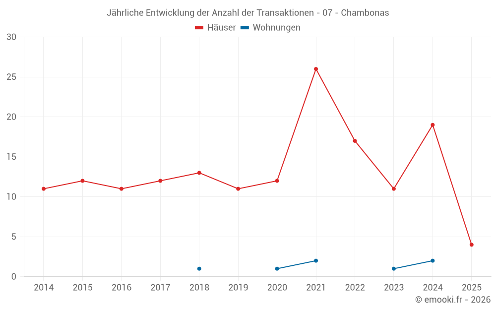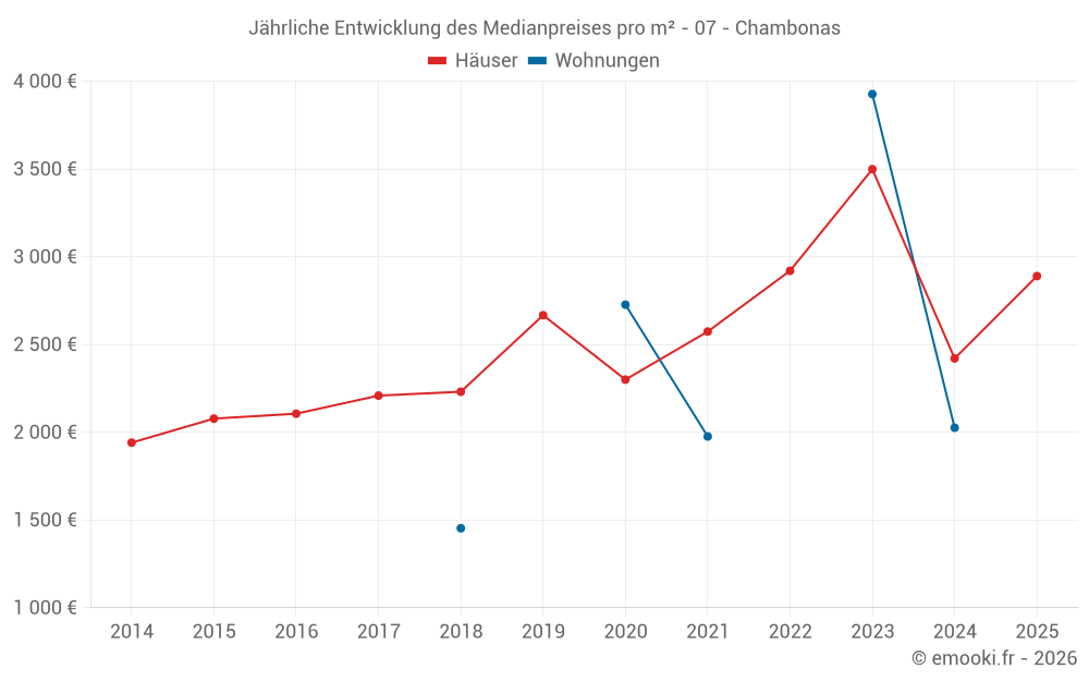 Der Durchschnittspreis auf den 16 Hausgeschäften der letzten 12 Monate in der Gemeinde Chambonas betrug 2 574 € pro Quadratmeter für einen mittleren Immobilienwert von 269 668 €. Über diesen Zeitraum hinweg lagen 60% der Transaktionen zwischen 2 114 und 3 456 € pro Quadratmeter (vom 2. bis zum 8. Dezil).