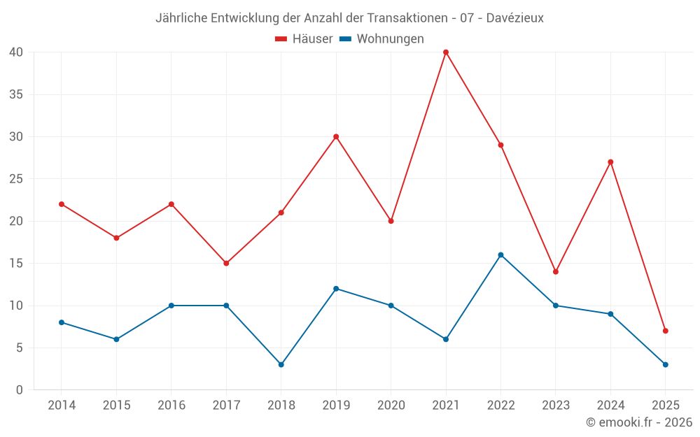 Der Durchschnittspreis auf den 20 Hausgeschäften der letzten 12 Monate in der Gemeinde Davézieux betrug 2 138 € pro Quadratmeter für einen mittleren Immobilienwert von 220 000 €. Über diesen Zeitraum hinweg lagen 60% der Transaktionen zwischen 1 595 und 2 623 € pro Quadratmeter (vom 2. bis zum 8. Dezil).