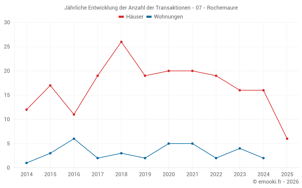 Der Durchschnittspreis auf den 16 Hausgeschäften der letzten 12 Monate in der Gemeinde Rochemaure betrug 2 184 € pro Quadratmeter für einen mittleren Immobilienwert von 221 450 €. Über diesen Zeitraum hinweg lagen 60% der Transaktionen zwischen 1 742 und 2 764 € pro Quadratmeter (vom 2. bis zum 8. Dezil).