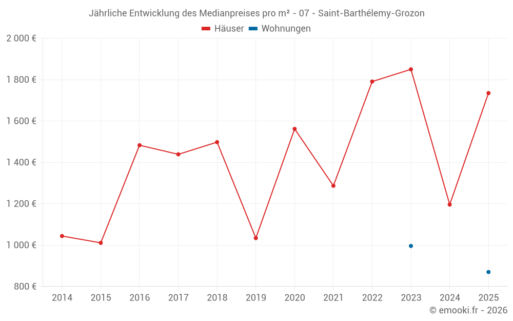 Der Durchschnittspreis auf den 15 Hausgeschäften der letzten 24 Monate in der Gemeinde Saint-Barthélemy-Grozon betrug 1 735 € pro Quadratmeter für einen mittleren Immobilienwert von 133 000 €. Über diesen Zeitraum hinweg lagen 60% der Transaktionen zwischen 1 032 und 2 583 € pro Quadratmeter (vom 2. bis zum 8. Dezil).