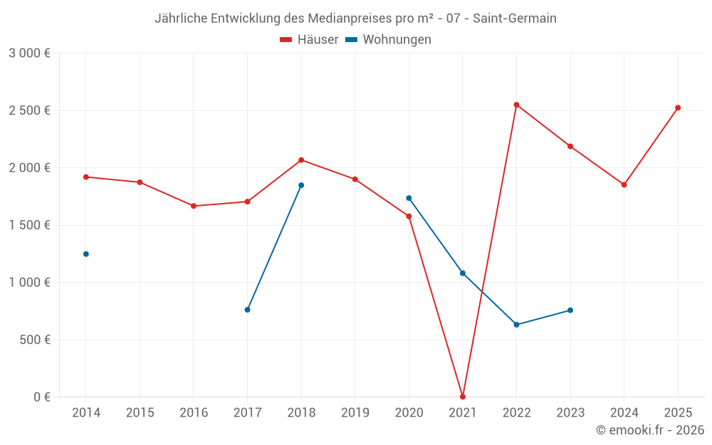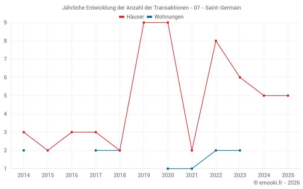 Der Durchschnittspreis auf den 15 Hausgeschäften der letzten 24 Monate in der Gemeinde Saint-Germain betrug 2 097 € pro Quadratmeter für einen mittleren Immobilienwert von 215 000 €. Über diesen Zeitraum hinweg lagen 60% der Transaktionen zwischen 1 467 und 2 743 € pro Quadratmeter (vom 2. bis zum 8. Dezil).