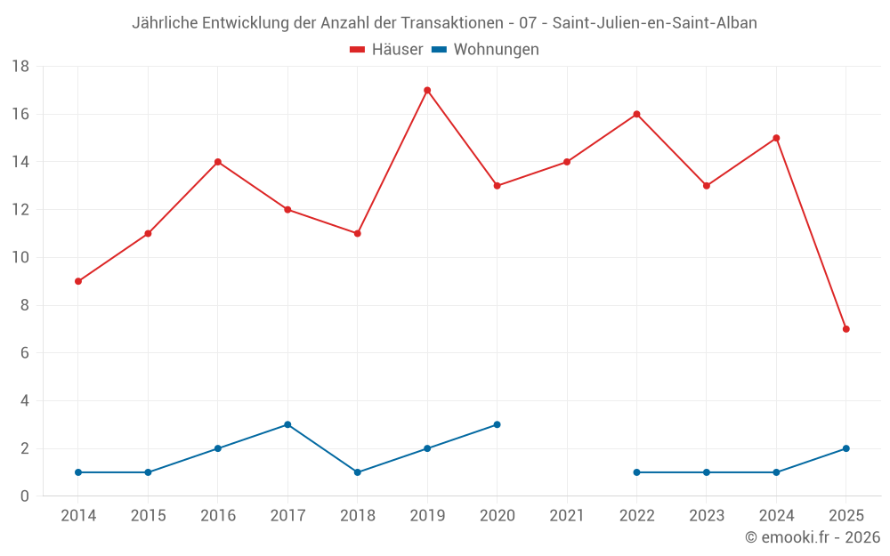 Der Durchschnittspreis auf den 16 Hausgeschäften der letzten 12 Monate in der Gemeinde Saint-Julien-en-Saint-Alban betrug 2 466 € pro Quadratmeter für einen mittleren Immobilienwert von 204 000 €. Über diesen Zeitraum hinweg lagen 60% der Transaktionen zwischen 1 934 und 2 682 € pro Quadratmeter (vom 2. bis zum 8. Dezil).