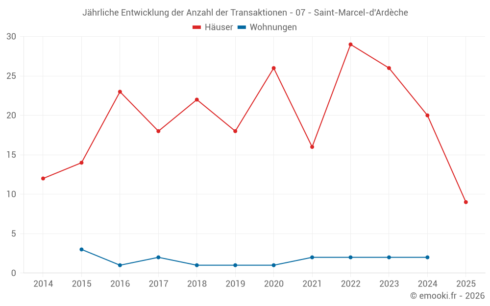 Der Durchschnittspreis auf den 20 Hausgeschäften der letzten 12 Monate in der Gemeinde Saint-Marcel-d'Ardèche betrug 2 458 € pro Quadratmeter für einen mittleren Immobilienwert von 240 500 €. Über diesen Zeitraum hinweg lagen 60% der Transaktionen zwischen 1 549 und 2 940 € pro Quadratmeter (vom 2. bis zum 8. Dezil).