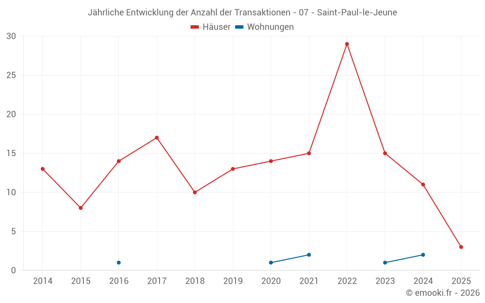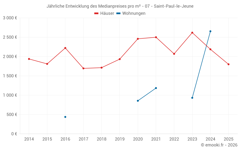 Der Durchschnittspreis auf den 21 Hausgeschäften der letzten 24 Monate in der Gemeinde Saint-Paul-le-Jeune betrug 1 972 € pro Quadratmeter für einen mittleren Immobilienwert von 182 500 €. Über diesen Zeitraum hinweg lagen 60% der Transaktionen zwischen 1 286 und 2 582 € pro Quadratmeter (vom 2. bis zum 8. Dezil).