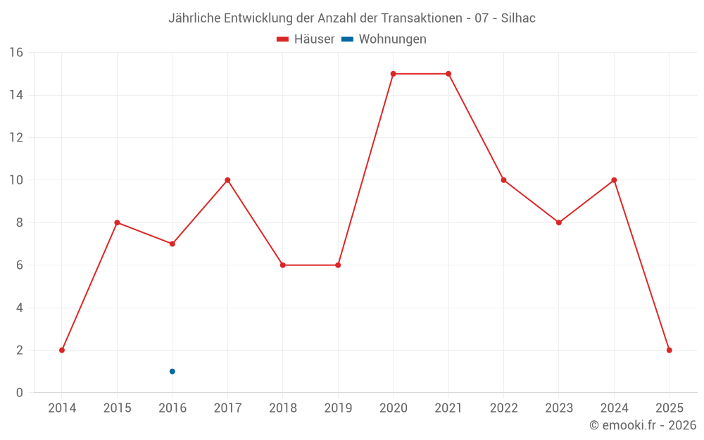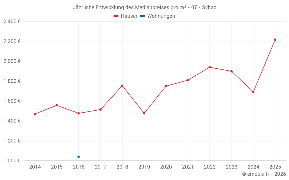 Der Durchschnittspreis auf den 16 Hausgeschäften der letzten 24 Monate in der Gemeinde Silhac betrug 1 753 € pro Quadratmeter für einen mittleren Immobilienwert von 167 250 €. Über diesen Zeitraum hinweg lagen 60% der Transaktionen zwischen 1 643 und 2 889 € pro Quadratmeter (vom 2. bis zum 8. Dezil).