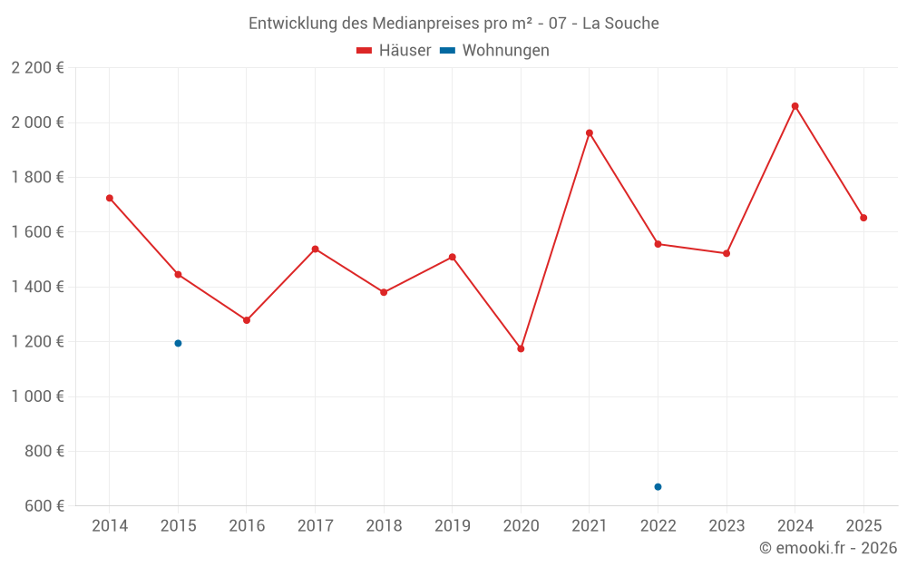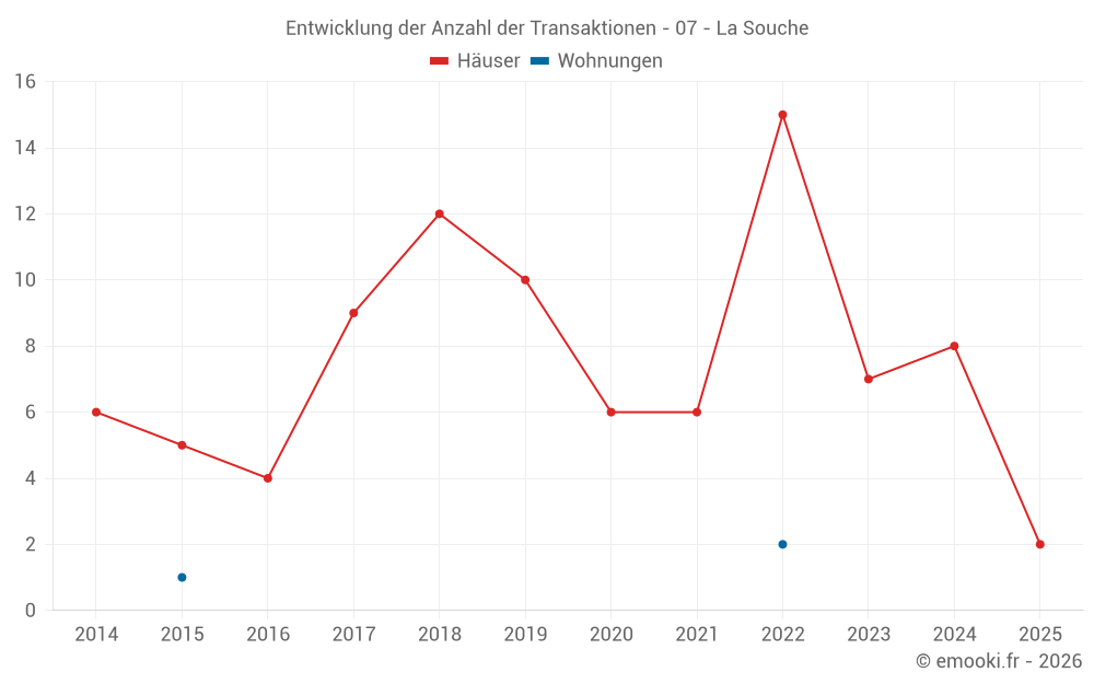 Der Durchschnittspreis auf den 14 Hausgeschäften der letzten 24 Monate in der Gemeinde La Souche betrug 1 794 € pro Quadratmeter für einen mittleren Immobilienwert von 154 000 €. Über diesen Zeitraum hinweg lagen 60% der Transaktionen zwischen 1 332 und 2 315 € pro Quadratmeter (vom 2. bis zum 8. Dezil).