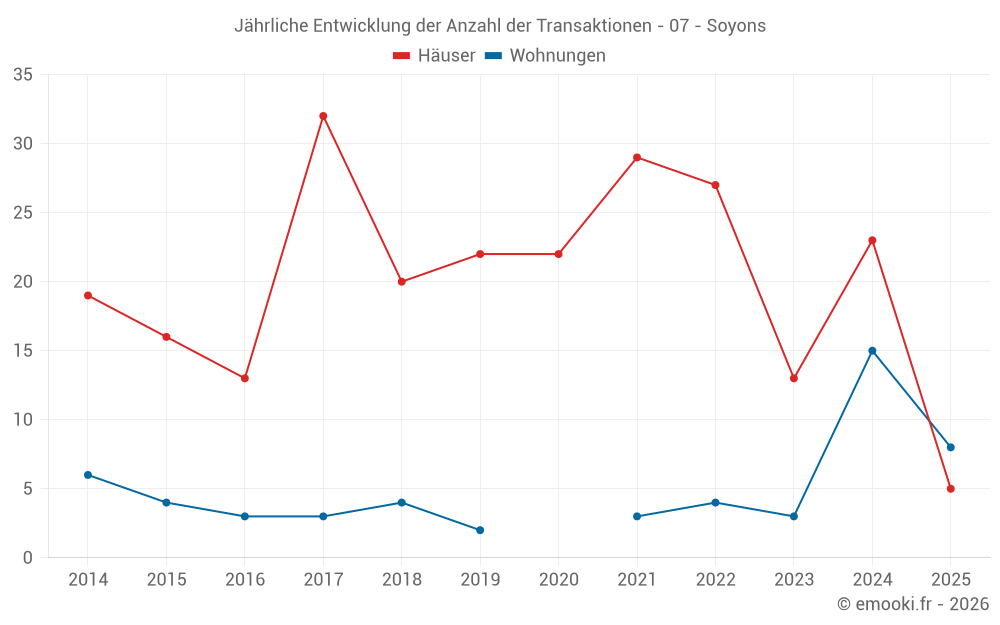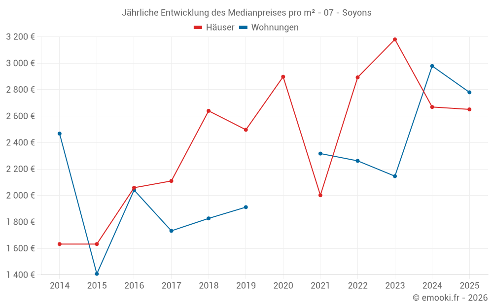 Der Durchschnittspreis auf den 34 Hausgeschäften der letzten 24 Monate in der Gemeinde Soyons betrug 2 728 € pro Quadratmeter für einen mittleren Immobilienwert von 298 800 €. Über diesen Zeitraum hinweg lagen 60% der Transaktionen zwischen 1 889 und 3 480 € pro Quadratmeter (vom 2. bis zum 8. Dezil).