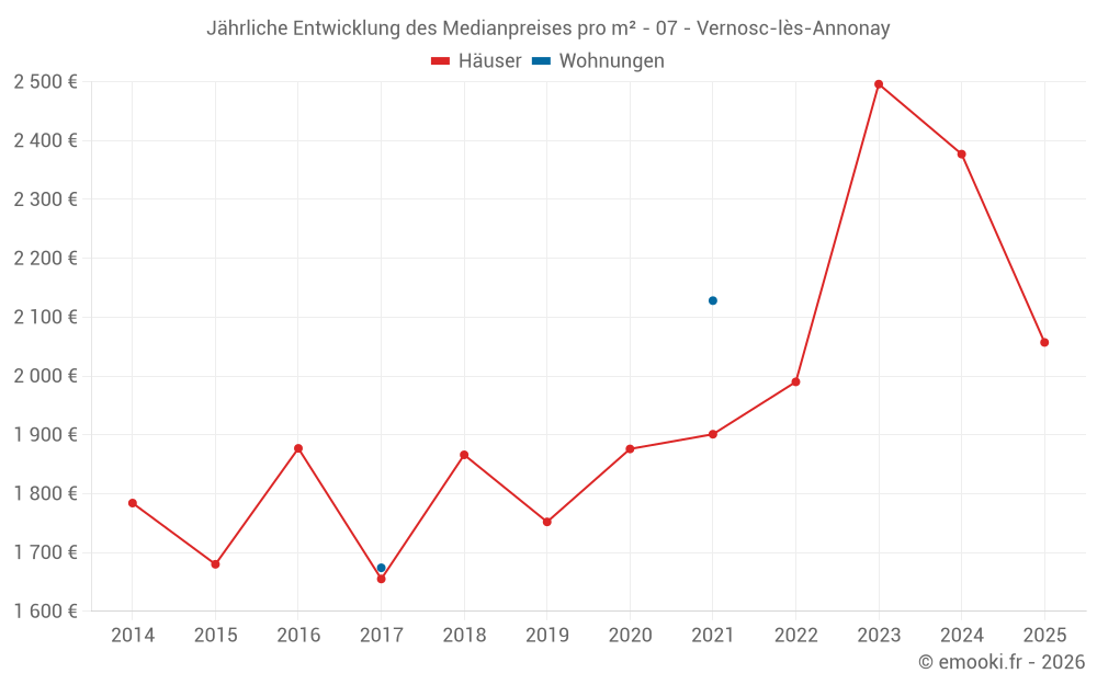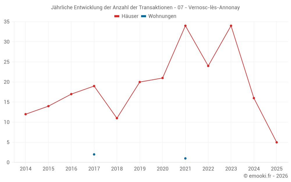 Der Durchschnittspreis auf den 18 Hausgeschäften der letzten 12 Monate in der Gemeinde Vernosc-lès-Annonay betrug 2 149 € pro Quadratmeter für einen mittleren Immobilienwert von 226 600 €. Über diesen Zeitraum hinweg lagen 60% der Transaktionen zwischen 1 151 und 2 855 € pro Quadratmeter (vom 2. bis zum 8. Dezil).