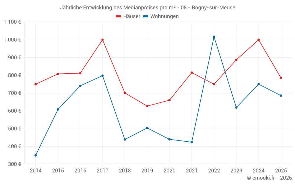 Der Durchschnittspreis auf den 28 Hausgeschäften der letzten 6 Monate in der Gemeinde Bogny-sur-Meuse betrug 786 € pro Quadratmeter für einen mittleren Immobilienwert von 64 000 €. Über diesen Zeitraum hinweg lagen 60% der Transaktionen zwischen 503 und 1 046 € pro Quadratmeter (vom 2. bis zum 8. Dezil).
