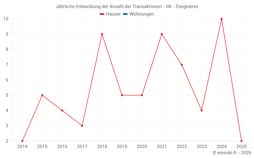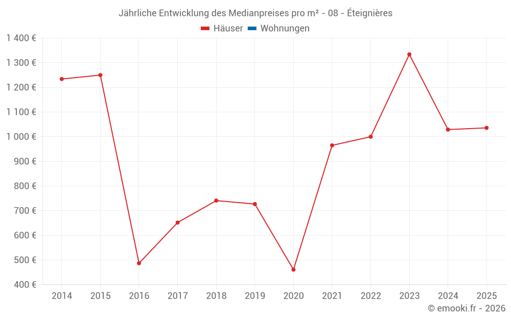 Der Durchschnittspreis auf den 14 Hausgeschäften der letzten 24 Monate in der Gemeinde Éteignières betrug 1 159 € pro Quadratmeter für einen mittleren Immobilienwert von 142 000 €. Über diesen Zeitraum hinweg lagen 60% der Transaktionen zwischen 790 und 1 669 € pro Quadratmeter (vom 2. bis zum 8. Dezil).