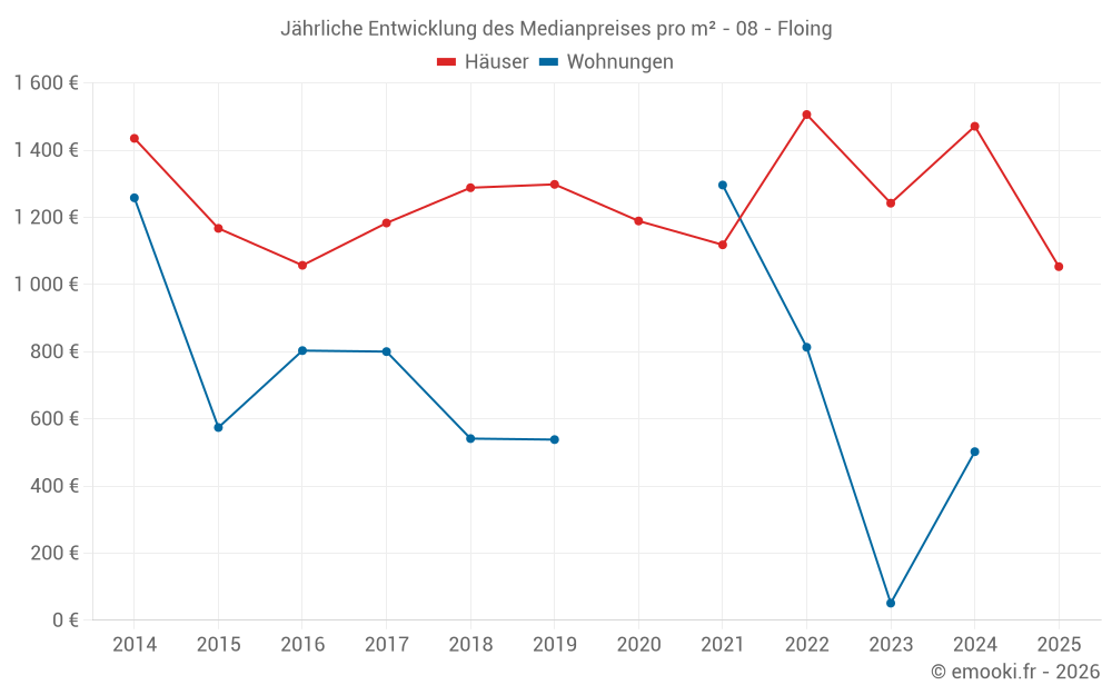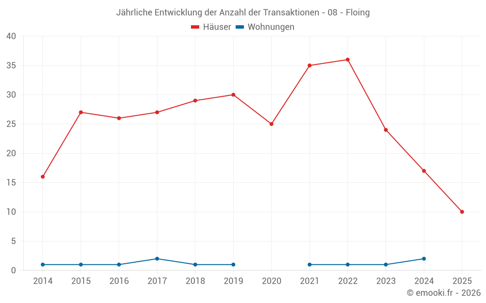 Der Durchschnittspreis auf den 21 Hausgeschäften der letzten 12 Monate in der Gemeinde Floing betrug 1 239 € pro Quadratmeter für einen mittleren Immobilienwert von 125 000 €. Über diesen Zeitraum hinweg lagen 60% der Transaktionen zwischen 804 und 1 732 € pro Quadratmeter (vom 2. bis zum 8. Dezil).
