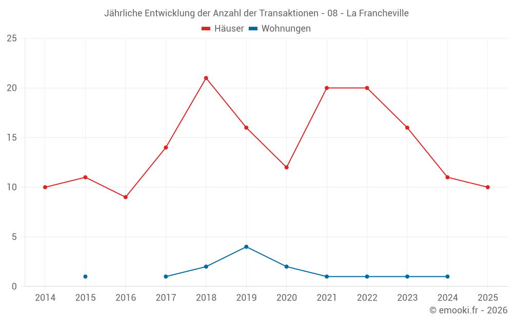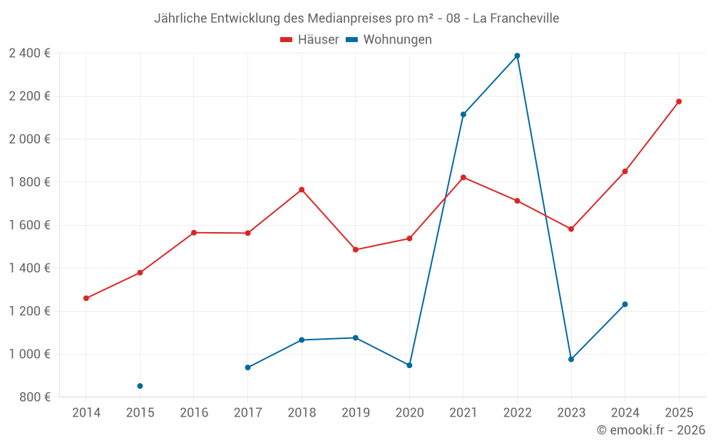 Der Durchschnittspreis auf den 17 Hausgeschäften der letzten 12 Monate in der Gemeinde La Francheville betrug 2 118 € pro Quadratmeter für einen mittleren Immobilienwert von 195 000 €. Über diesen Zeitraum hinweg lagen 60% der Transaktionen zwischen 1 820 und 2 331 € pro Quadratmeter (vom 2. bis zum 8. Dezil).