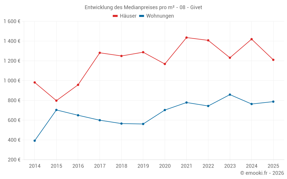 Der Durchschnittspreis auf den 23 Hausgeschäften der letzten 6 Monate in der Gemeinde Givet betrug 1 211 € pro Quadratmeter für einen mittleren Immobilienwert von 115 000 €. Über diesen Zeitraum hinweg lagen 60% der Transaktionen zwischen 861 und 1 656 € pro Quadratmeter (vom 2. bis zum 8. Dezil).