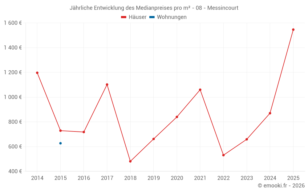 Der Durchschnittspreis auf den 15 Hausgeschäften der letzten 24 Monate in der Gemeinde Messincourt betrug 870 € pro Quadratmeter für einen mittleren Immobilienwert von 86 000 €. Über diesen Zeitraum hinweg lagen 60% der Transaktionen zwischen 458 und 1 511 € pro Quadratmeter (vom 2. bis zum 8. Dezil).